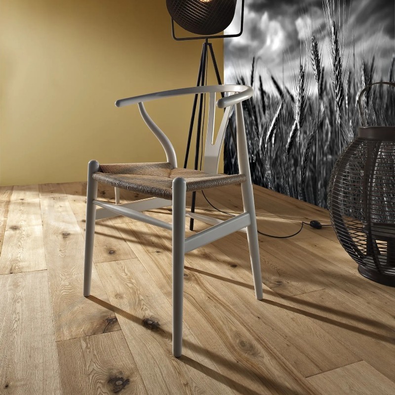 Kahrs Artisan Collection – Straw is one of the most rustic and character-rich floors in the Artisan range. Crafted from single-strip oak, each plank features heavy handscraping and brushing to enhance the natural grain, knots, and cracks. The surface is smoked and whitewashed, creating a unique white-blue undertone that contrasts beautifully with the warm beige and golden hues of the oak.