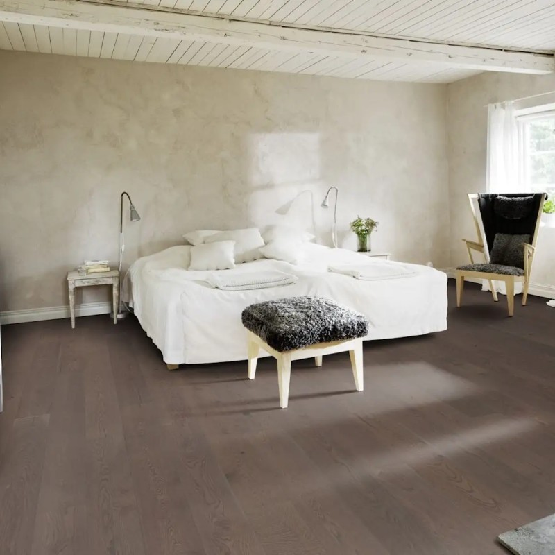 Kahrs Beyond Retro Collection – Charcoal Light 2000mm is a richly toned, single-strip oak floor inspired by the warmth of dried raisins soaked in hot chocolate. Each plank is deeply stained and smoked, revealing a complex palette of dark browns with subtle variation. The surface is brushed to enhance grain texture and microbevelled on all four sides for a defined, full-plank appearance.