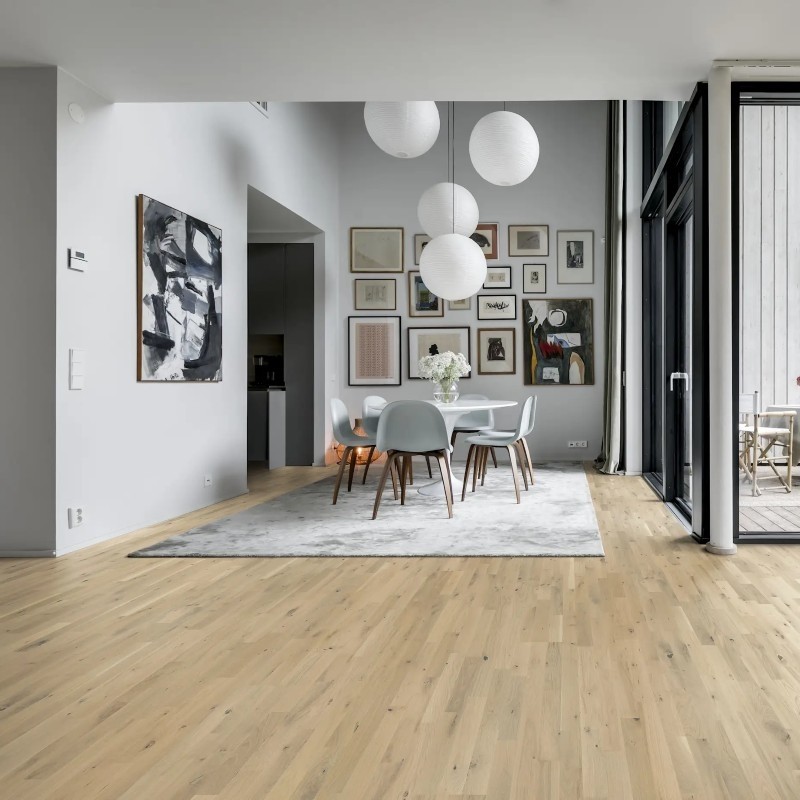 Kahrs Beyond Retro Collection – Frosted Oat 2423mm is a single-strip oak floor inspired by frost-covered grain fields in late autumn. Each plank is softly white-stained, allowing the rustic oak grain to show through with gentle transparency. The surface is brushed and microbevelled on all four sides, enhancing the tactile texture and delivering a refined, full-plank aesthetic.