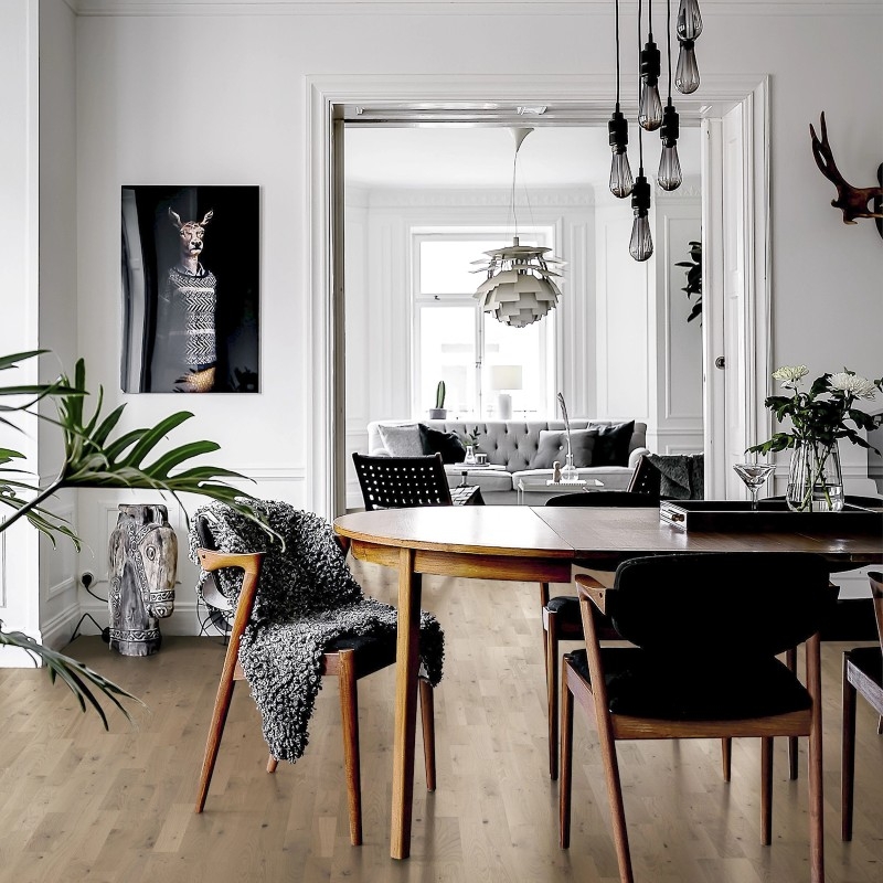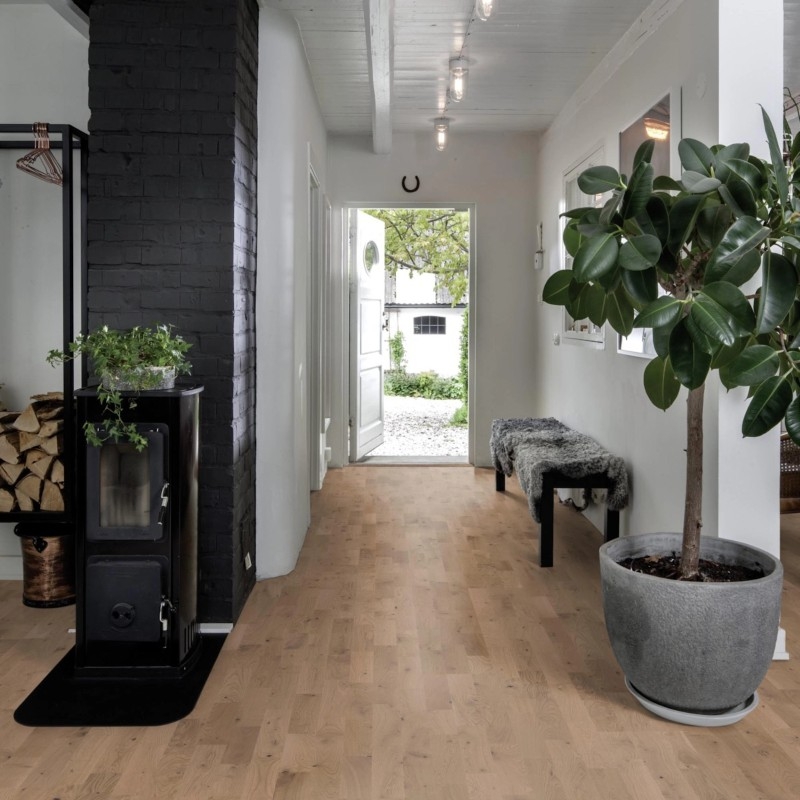 Kahrs Beyond Retro Collection – Frozen Hazelnut 2423mm is a single-strip oak floor that captures the soft warmth of a rosé-toned cashmere scarf. Each plank is subtly stained and smoked to reveal gentle colour variation and rustic grain detail. The surface is brushed and microbevelled on all four sides, enhancing the tactile texture and delivering a refined, full-plank aesthetic.