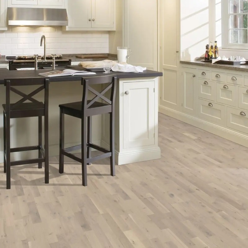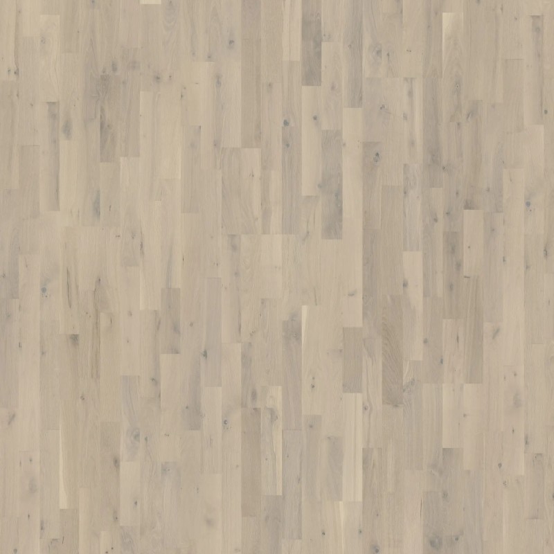 Kahrs Beyond Retro Collection – Loft White 2421mm is a single-strip oak floor inspired by the soft pastel tones of vanilla ice cream with grey accents. Each plank is lightly stained to allow the natural grain, knots, and cracks to show through, creating a surface that feels both organic and refined. The wood is brushed and microbevelled on all four sides, enhancing texture and delivering a clean, full-plank aesthetic.