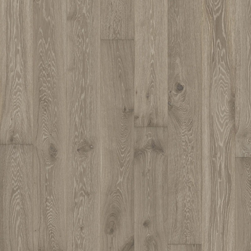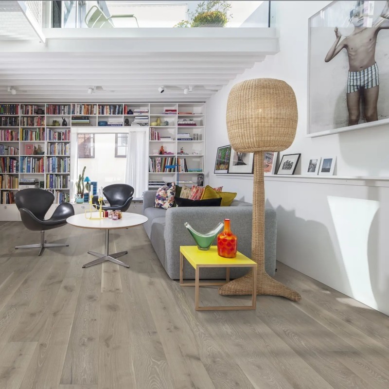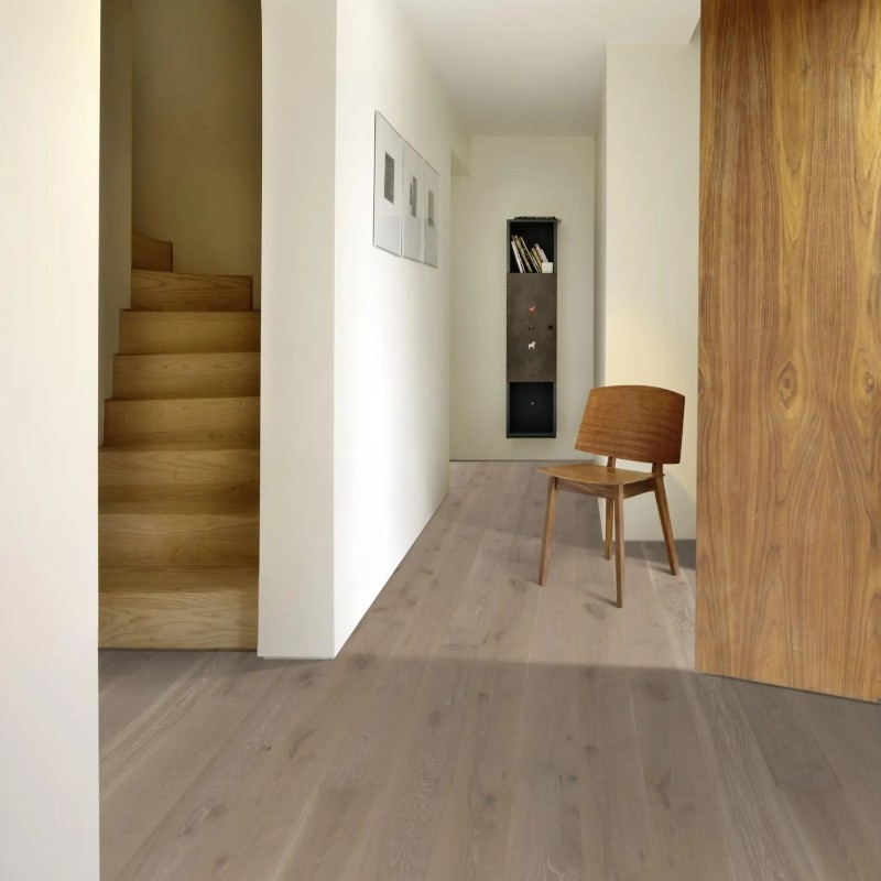 Kahrs Classic Collection – Nouveau Gray is a contemporary oak floor that blends light grey tones with subtle earthy accents. The surface features visible sapwood elements, adding natural variation and depth to the otherwise neutral palette. Each board is brushed and microbevelled on all four sides, enhancing texture and delivering a clean, full-length aesthetic.