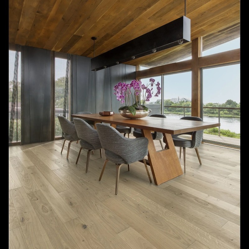 White-pigmented oak with brushed grain and subtle knots. Matt lacquer finish and 2420mm plank length.
