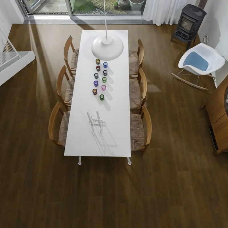 Kahrs Harmony Collection – Oak Brownie showcases deep chocolate hues that allow the warmer undertones of oak to emerge, creating a rich and expressive aesthetic. The brushed surface treatment enhances the wood’s natural grain and texture, while the matt lacquer finish provides low-sheen protection that reduces glare and preserves the floor’s rustic charm.