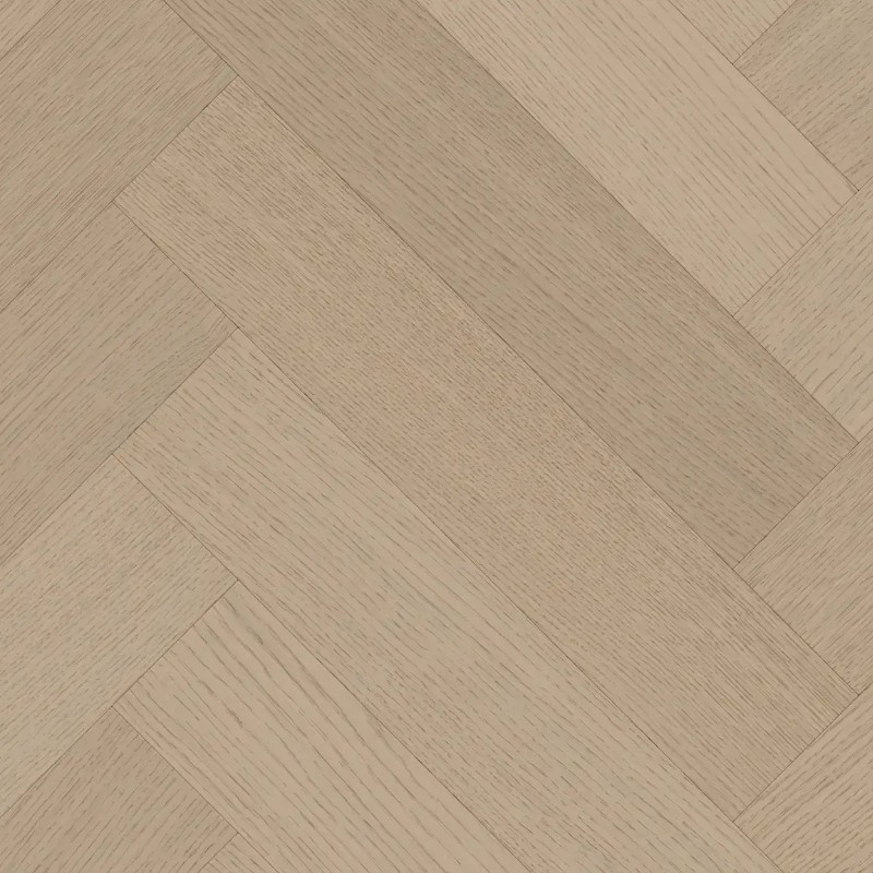 Kahrs Life Authentic Herringbone Collection – Mint delivers a serene oak aesthetic with light greige tones and subtle grain movement, arranged in a classic herringbone pattern that adds elegance and visual rhythm. The brushed surface highlights the wood’s natural texture, while the ultra-matt lacquer finish provides a smooth, low-sheen surface that softens light and enhances the floor’s contemporary appeal.