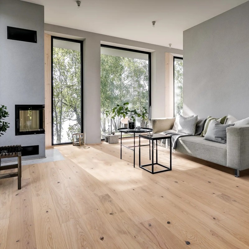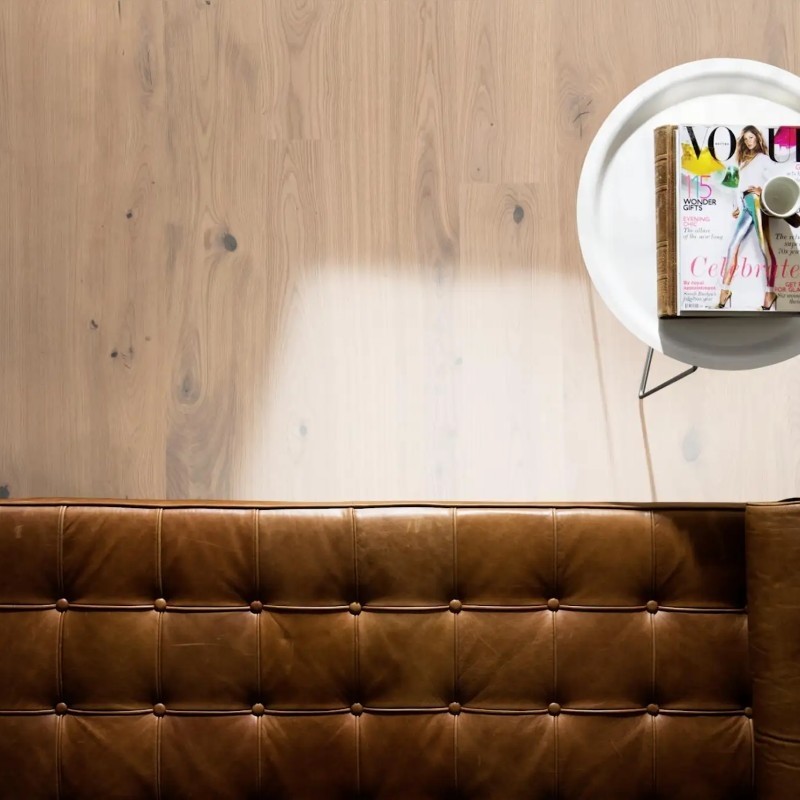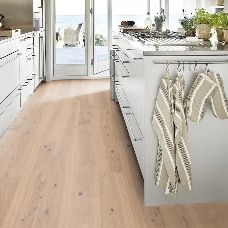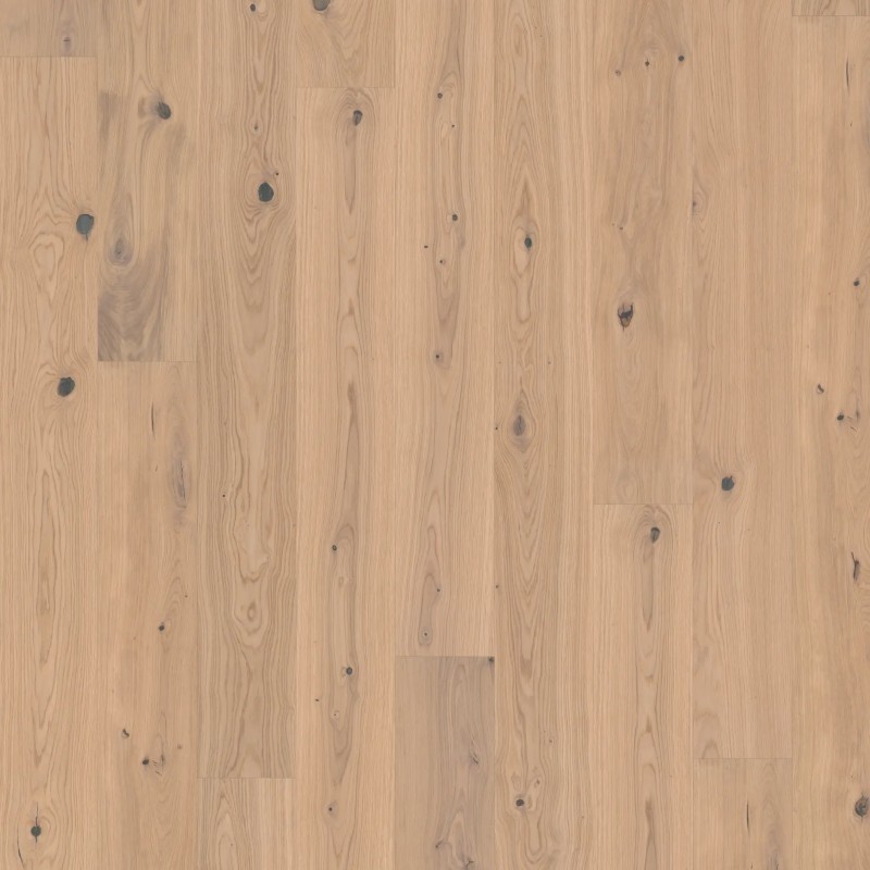 Kahrs Life Authentic Collection – Tahini delivers a light, rustic oak aesthetic with silver-golden tones and darker knots, evoking the organic warmth of tahini. The brushed surface enhances the wood’s natural grain, while the ultra-matt lacquer finish provides a low-sheen, durable surface that resists scratches, stains, and UV fading.