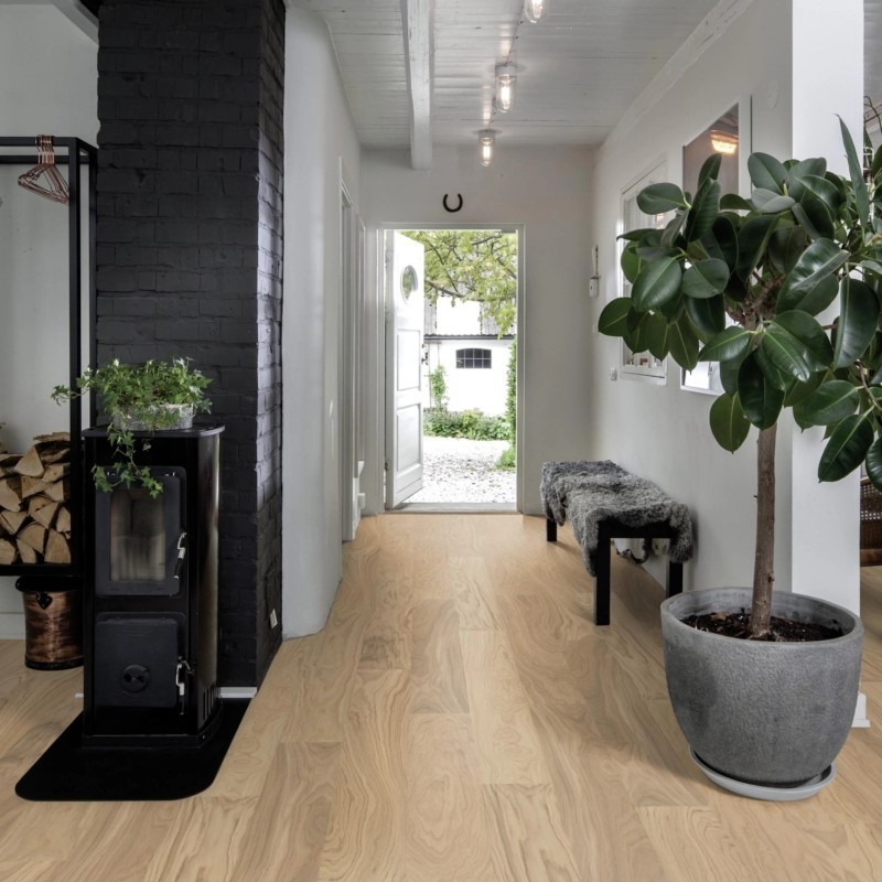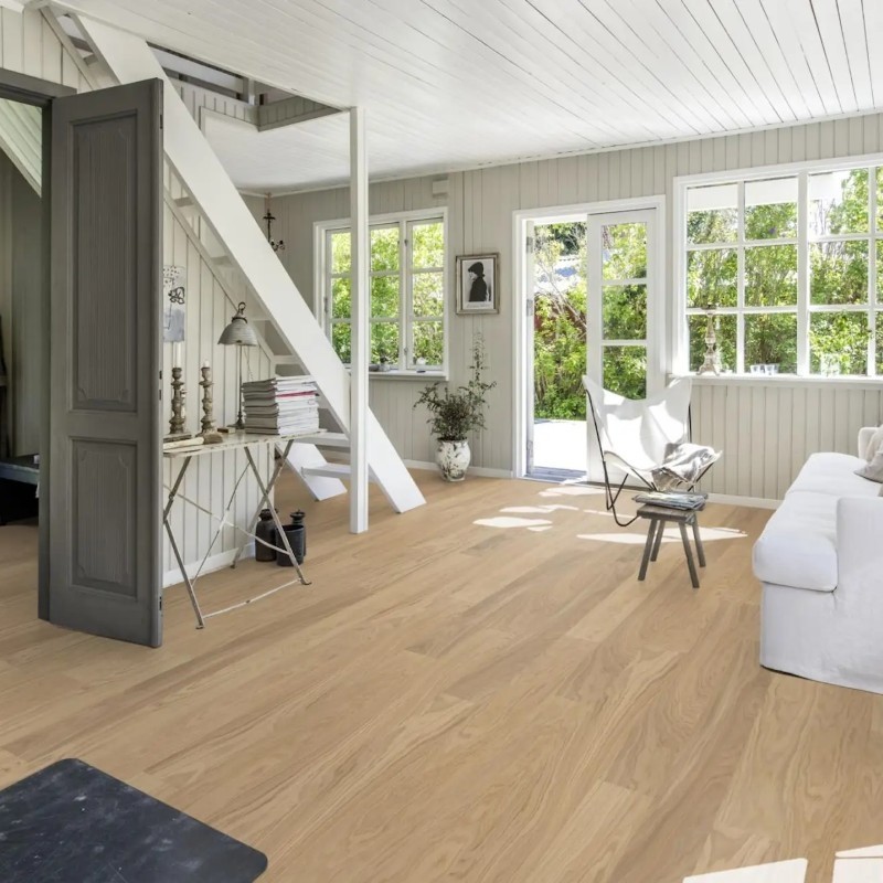Kahrs Life Essential Collection – Whole Grain Wide delivers a warm, sunlit oak aesthetic with golden tones and subtle grain movement, evoking the look of ripened grain fields. The wide single-strip plank format enhances spatial flow and visual calm, while four-sided microbevelled edges create a clean, full plank look.
