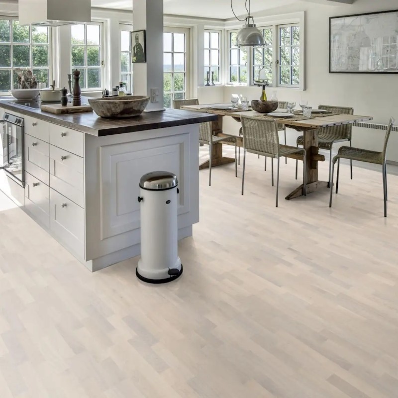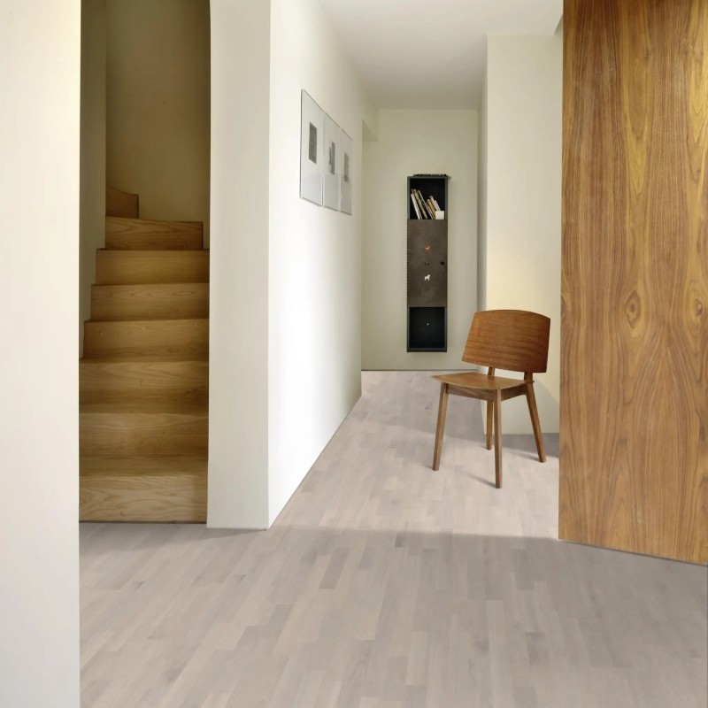 Kahrs Lumen Collection – Oak Rime delivers a light, airy oak aesthetic with a semi-transparent white stain that balances light and dark contrasts in the wood, allowing subtle warm oak tones to softly filter through. The 3-strip design creates a classic, lifeful parquet effect, ideal for brightening interiors and enhancing spatial openness.