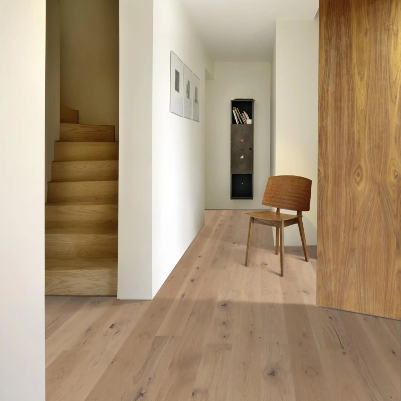 Kahrs Lux Collection – Oak Biscotti (2266mm) offers timeless elegance with a warm natural oak stain, enhanced by deep brushing and ultra-matt lacquer that mimics the look of freshly sawn timber. The extra-long 2266mm single-strip planks create a spacious, seamless aesthetic, while four-sided microbevelled edges emphasize each board’s full-plank character.