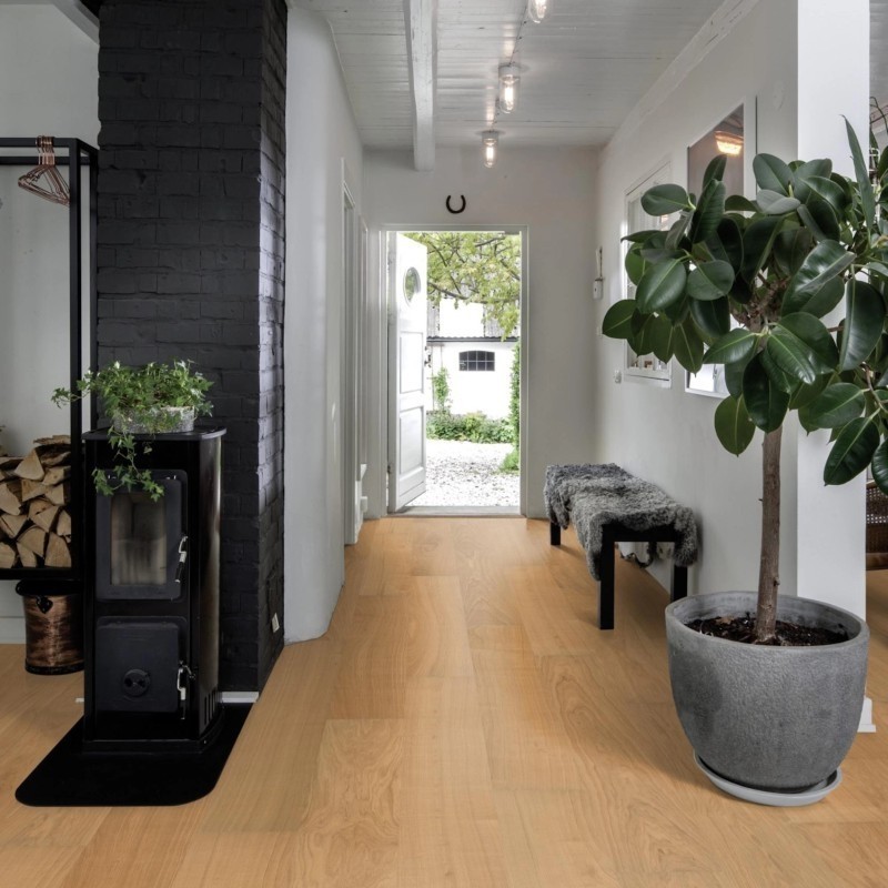 Kahrs Piazza Collection – Oak AB White offers a refined Scandinavian aesthetic with its clean oak grain, subtle colour variation, and misty white oiled finish. The AB grading ensures a calm visual with minimal knots and moderate tonal shifts, allowing the natural beauty of oak to shine through without distraction.