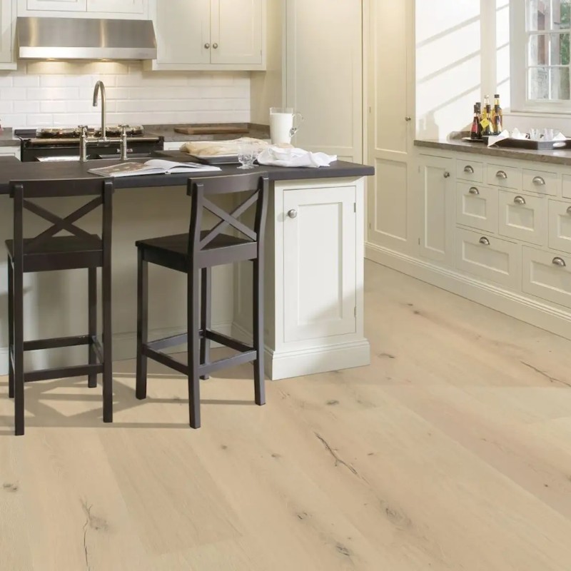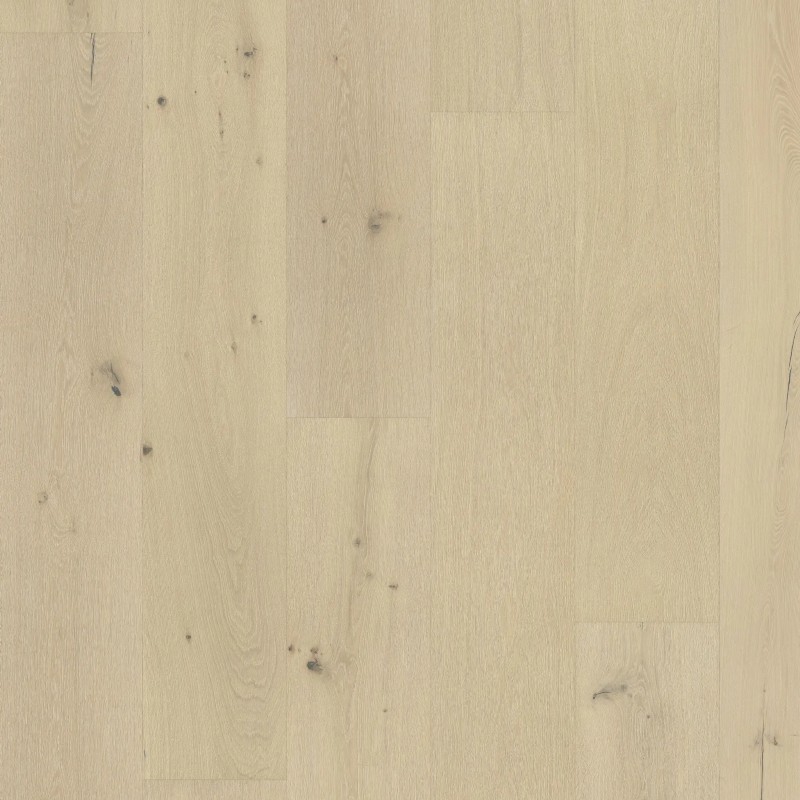 Kahrs Royal Collection – Oak Buckingham offers a refined, stately oak floor with soft whitewashed tones and elegant proportions. The surface is treated with a misty white transparent stain that enhances the natural variation in the grain, allowing subtle gradations and organic detail to show through.