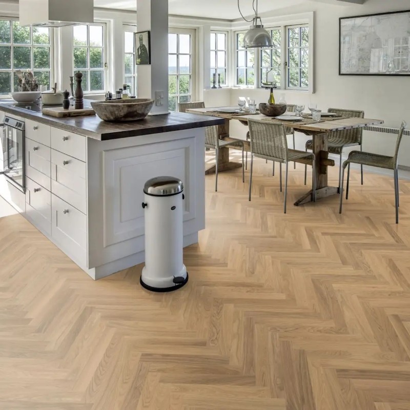 Kahrs Studio Herringbone AB White Oiled offers refined oak with a timeless herringbone pattern and natural oiled finish.