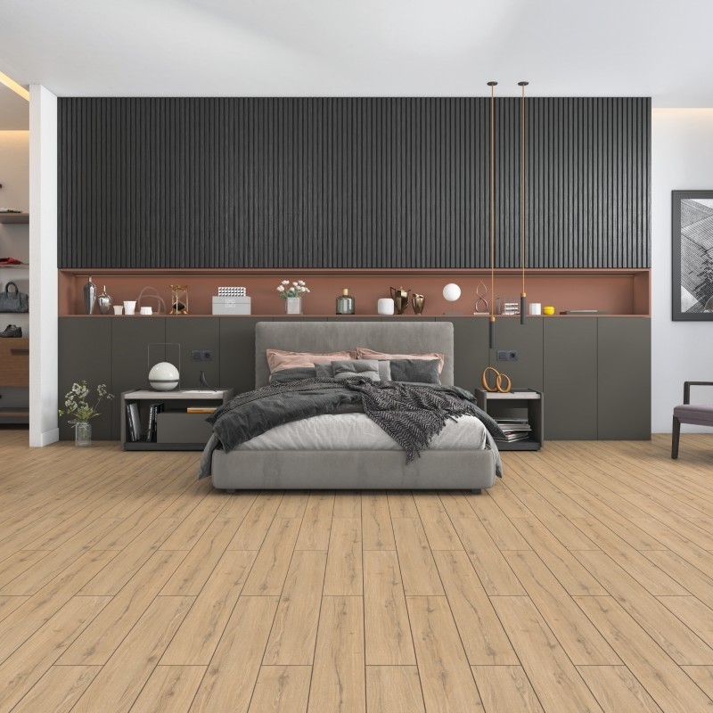 Elite XL Manila offers a fresh oak finish in a wide laminate plank. Durable and easy to maintain, it brightens contemporary interiors.