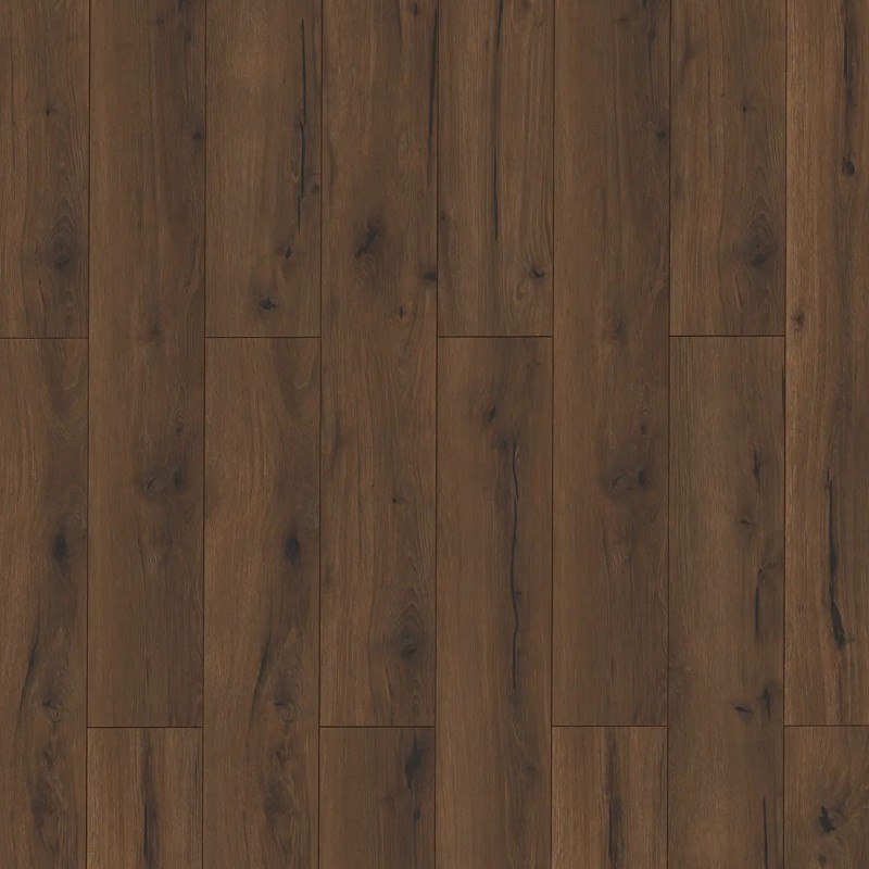 Rustic dark brown oak-look laminate plank.
