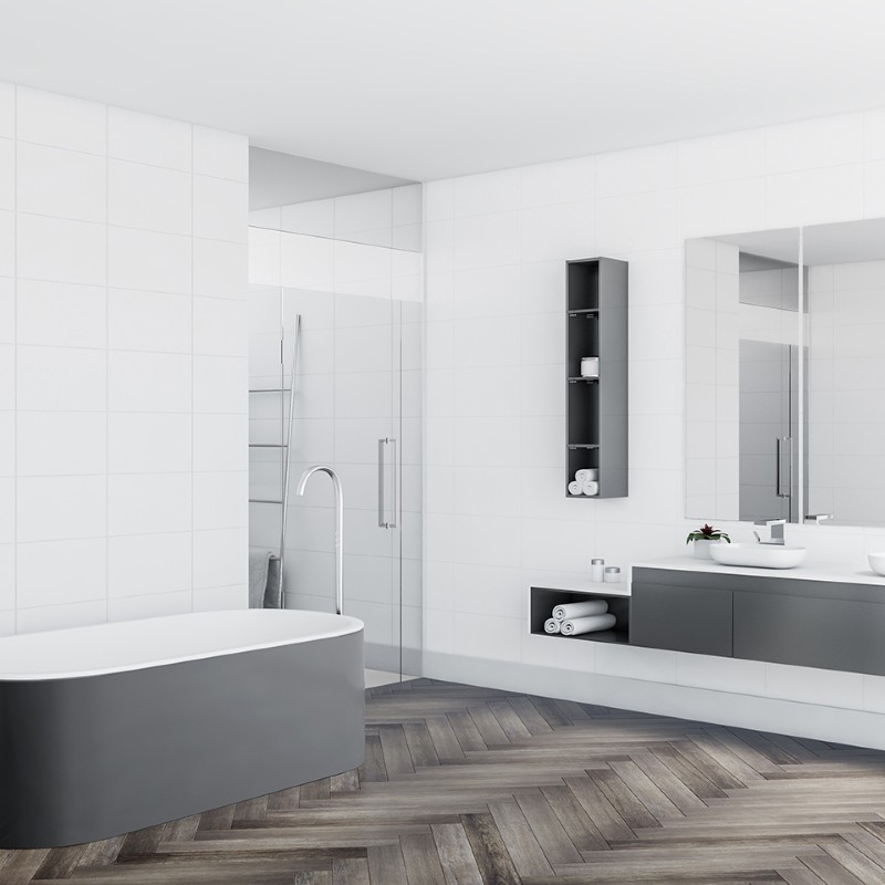 A bold charcoal-toned herringbone plank with waterproof resilience and lifetime domestic warranty.