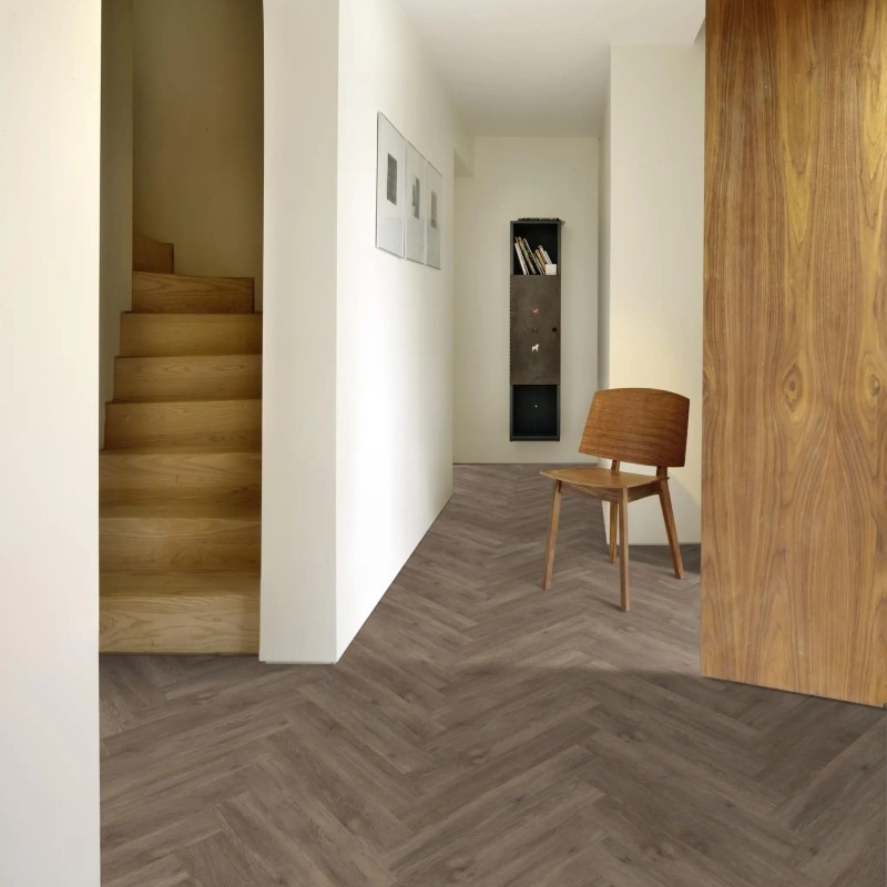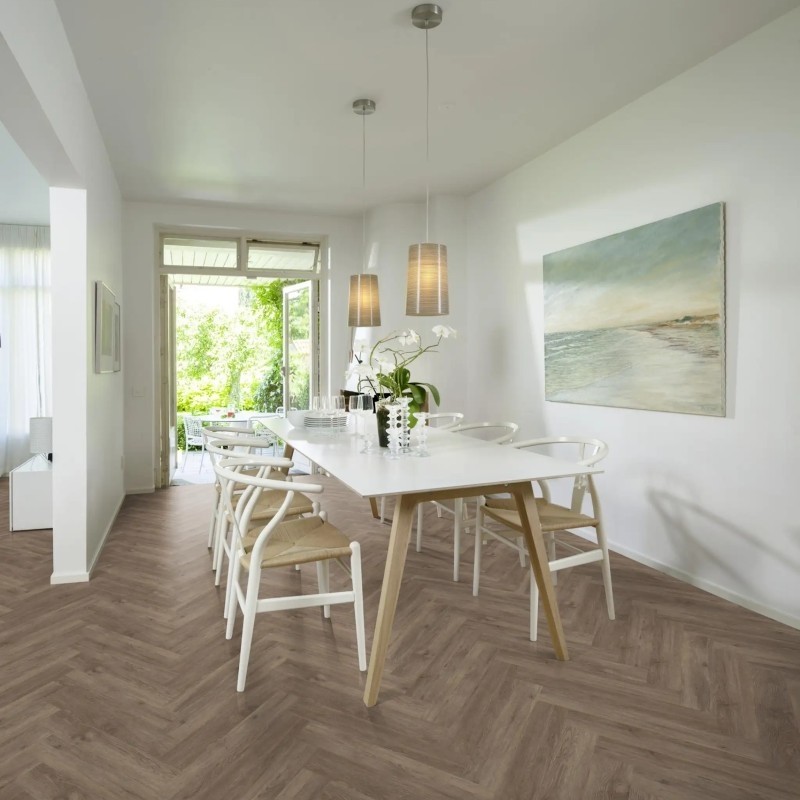 Kahrs Herringbone Click Collection – Sarek brings light oak tones and subtle wood grain detailing to a classic herringbone layout, offering a floor that blends Scandinavian simplicity with modern performance. The microbevelled edges define each plank, while the ceramic-coated surface enhances durability and ease of maintenance.