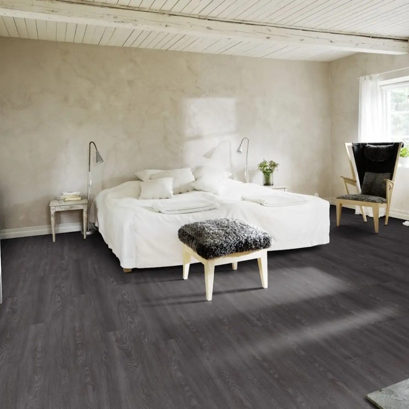 Kahrs Dryback Collection – Humboldt is a striking luxury vinyl tile (LVT) floor that blends deep oak tones with high-performance construction. The design features a dark, dramatic wood grain effect, ideal for interiors that embrace bold styling, contrast, and natural materials.