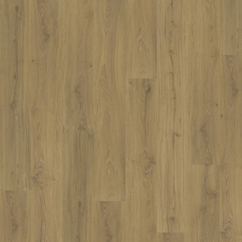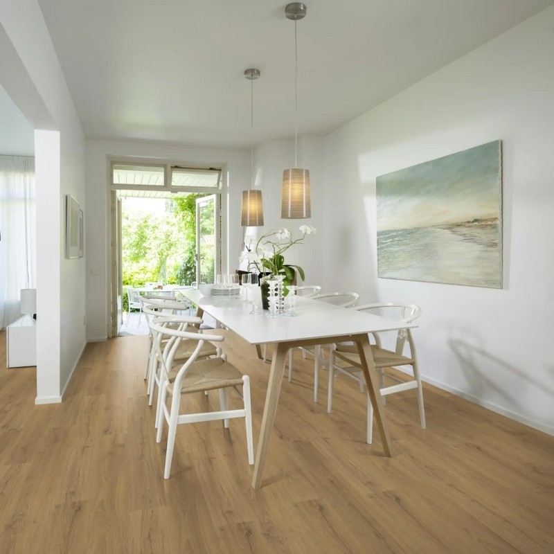 Warm oak-effect LVT floor. XXL plank format, ceramic coating, rigid SPC core, built-in underlay, and 6mm thickness.