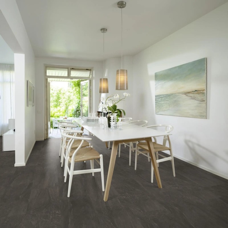 Kahrs Impression Stone Collection – Amaro delivers a soothing slate aesthetic with subtle tonal variation and a matte surface, ideal for creating a contemporary, spa-like atmosphere. The registered embossing mimics natural stone texture, while the ceramic-coated surface enhances durability, scratch resistance, and water protection.