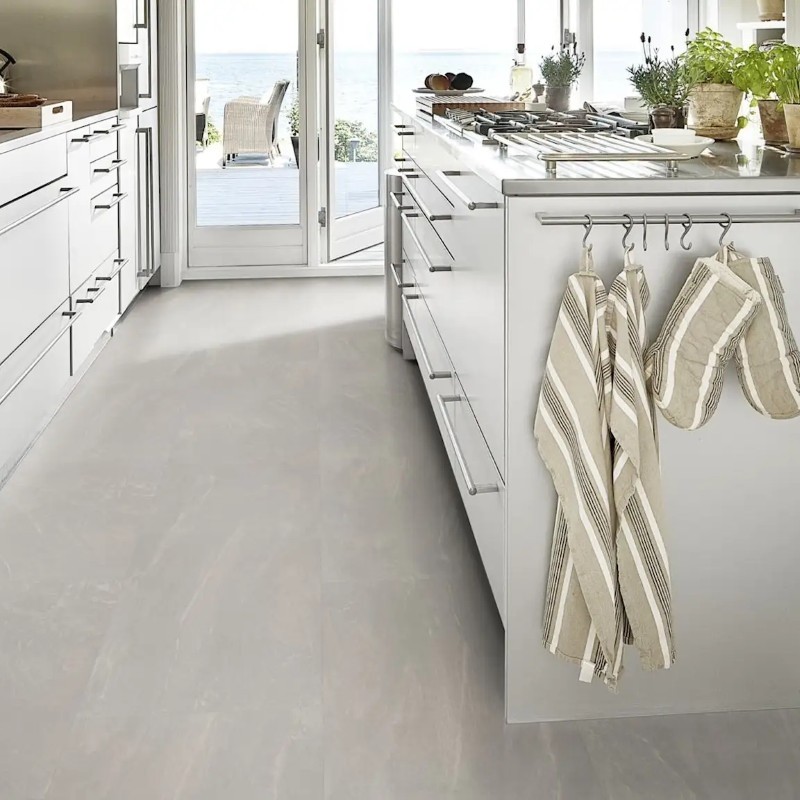 Kahrs Impression Stone Collection – Athos delivers a refined stone aesthetic with subtle grey tones and natural variation, creating a clean, architectural surface ideal for spa-inspired and minimalist interiors. The registered embossing mimics authentic stone texture, while the ceramic-coated surface enhances durability, scratch resistance, and water protection.