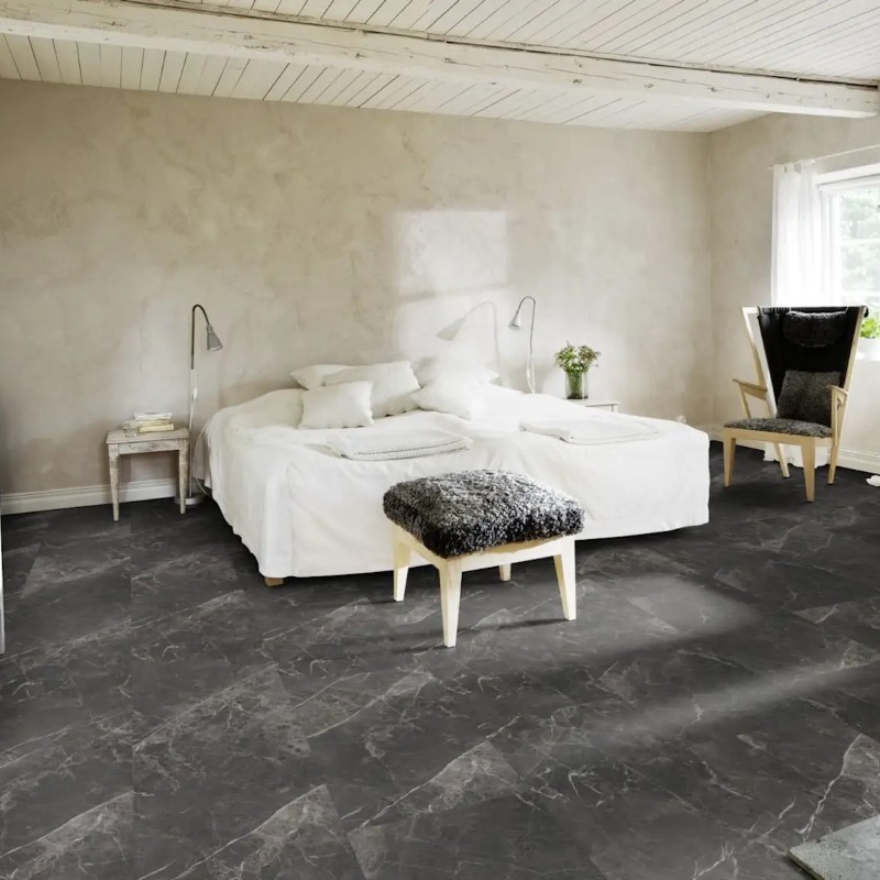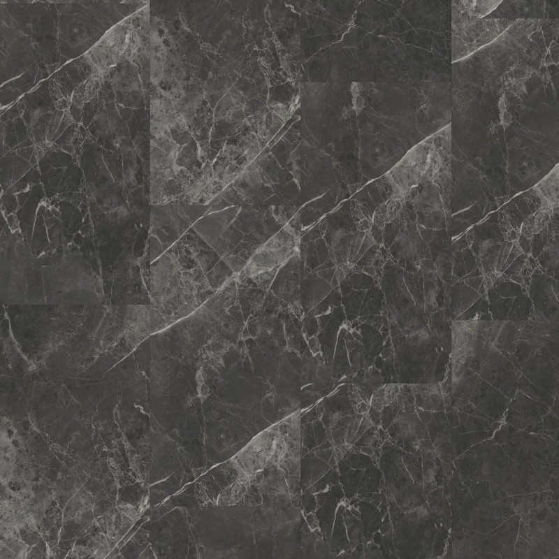 Dark grey marble-effect LVT tile. XXL format, ceramic coating, rigid SPC core, built-in underlay, and 6mm thickness.