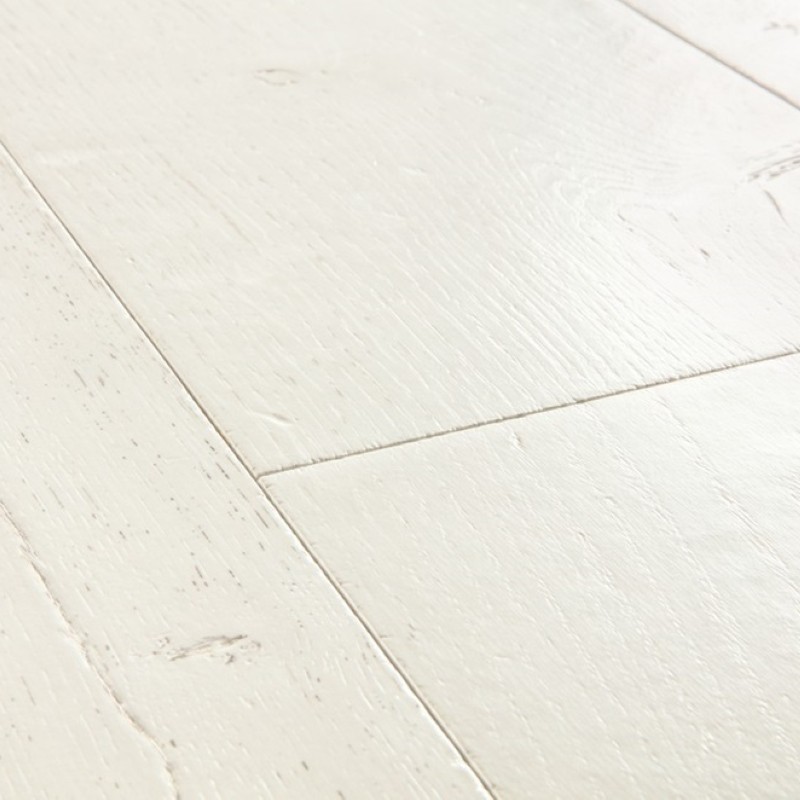Clean white painted‑oak laminate with subtle grain.