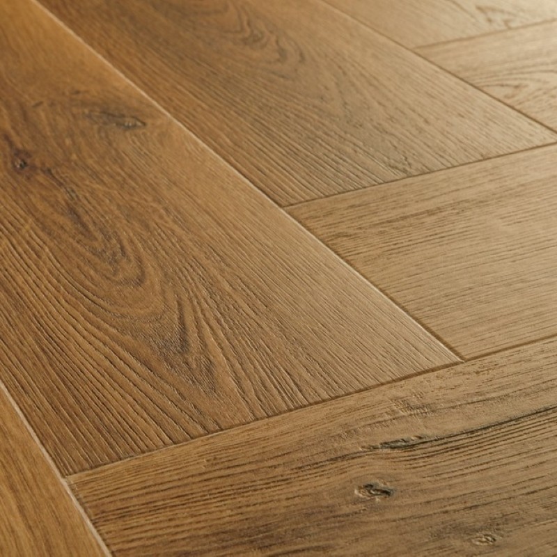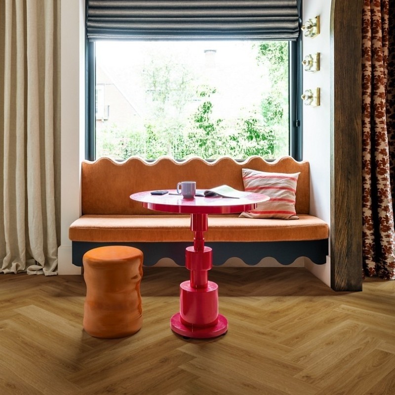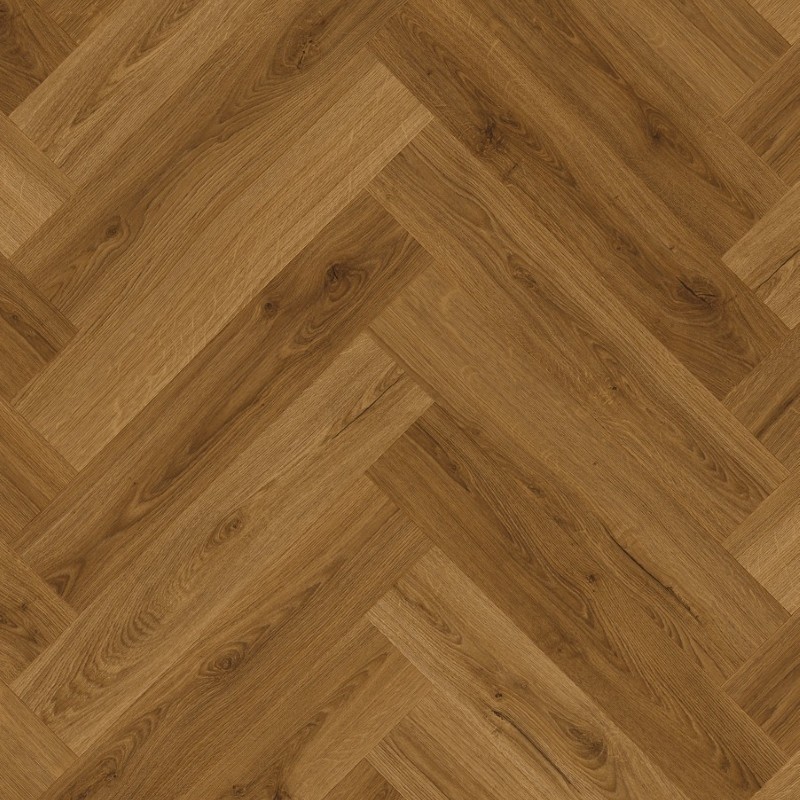 Warm caramel‑oak herringbone LVT.