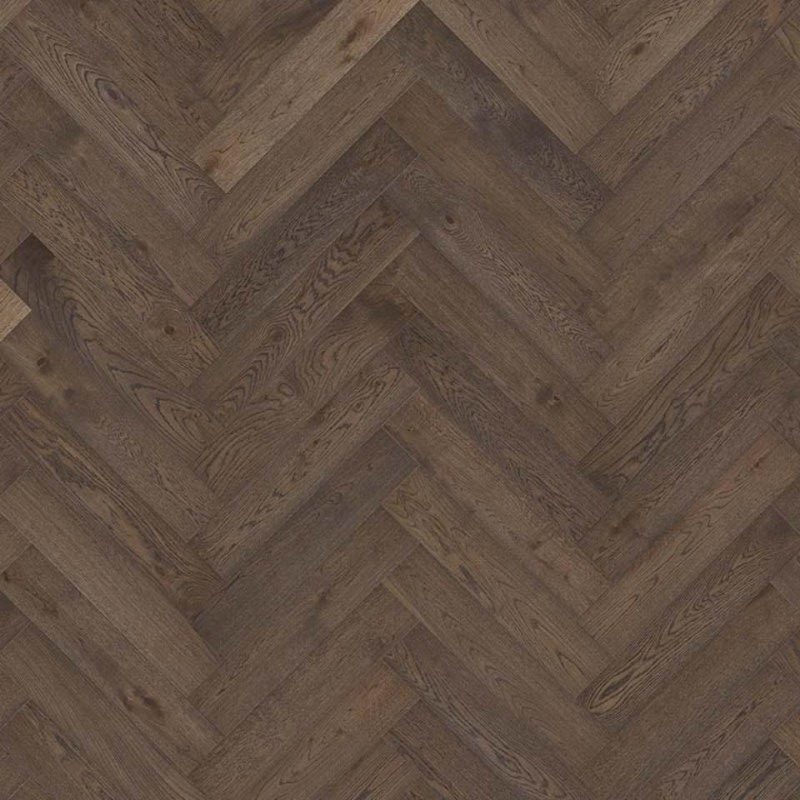 The herringbone-pattern installation allows creative geometric layouts. Practical features include easy installation, underfloor heating compatibility, and refinishing options.