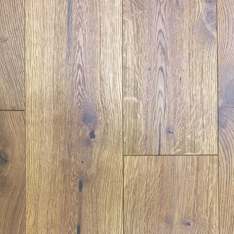 A smoked engineered oak floor with brushed textures, highlighting knots and grain.