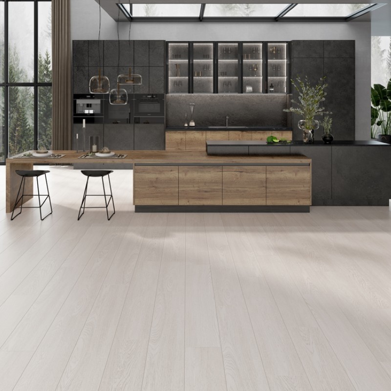 Easy to maintain and durable, this laminate floor suits minimalist interiors.